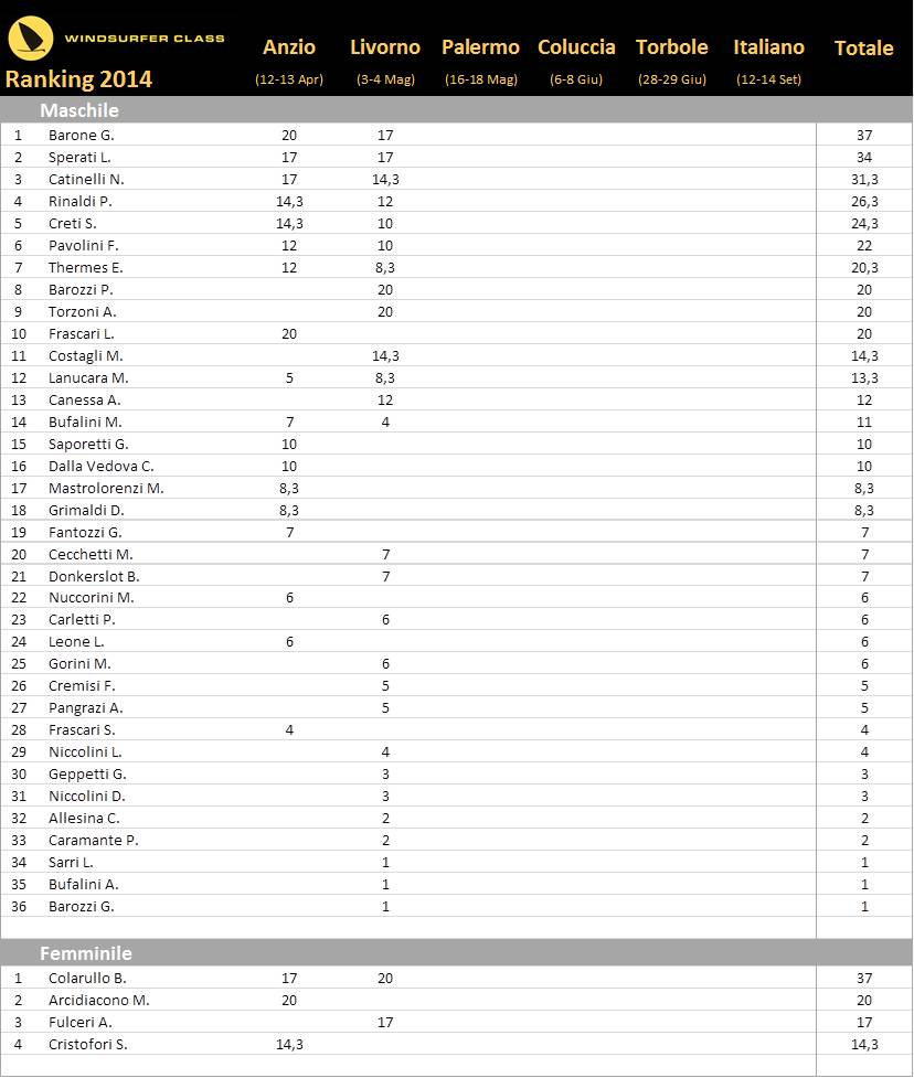 Alla luce dei risultati della seconda tappa inizia ad accendersi anche la competizione nella classifica del ranking nazionale, che, dopo due prove vede al comando Barone con 37 punti, seguito da Sperati con 34 e Catinelli con 31,3.