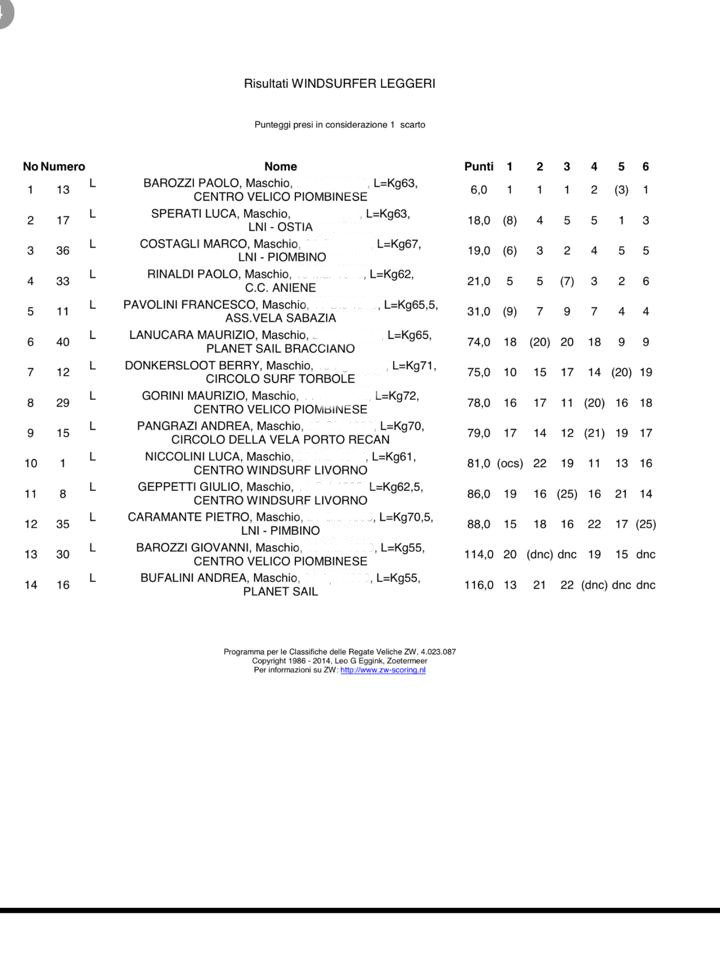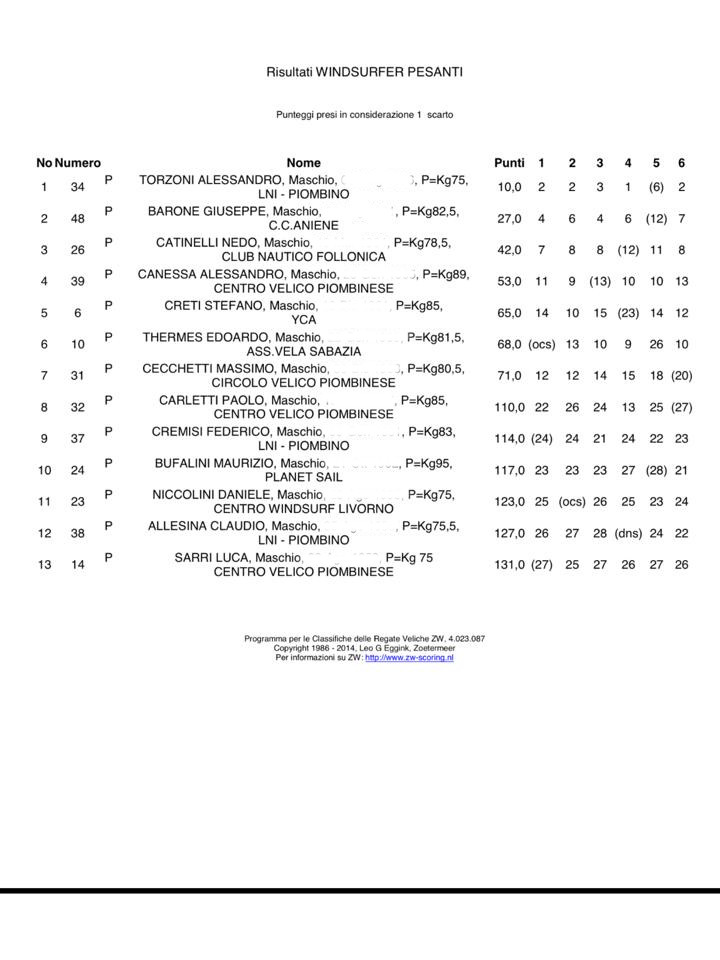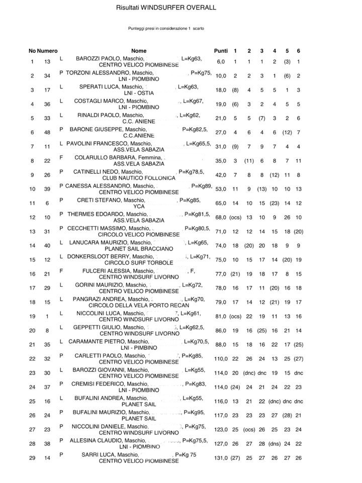La prima giornata e’ stata caratterizzata da grecale da terra leggero tra i 6 e i 10 nodi, molto rafficato e con salti di vento repentini. La bravura e la tecnica dei regatanti e’ stata messa a dura prova, e non a caso si e’ imposto come dominatore assoluto delle tre prove disputate il grande Paolo Barozzi che ha preceduto Alessandro Torzoni, primo dei pesanti, ed il velocissimo Luca Sperati. La seconda giornata il vento si è fatto un pò attendere, e dopo la prima prova disputata ancora con grecale leggero, finalmente si e’ steso un buon maestralino sui 10-12 nodi, che ha permesso ai regatanti di divertirsi e disputare le ultime due prove. Sempre sugli scudi Paolo Barozzi, ma in grande evidenza ancora sia Torzoni che Sperati, entrambi autori di un primo assoluto rispettivamente nella quarta e quinta prova.